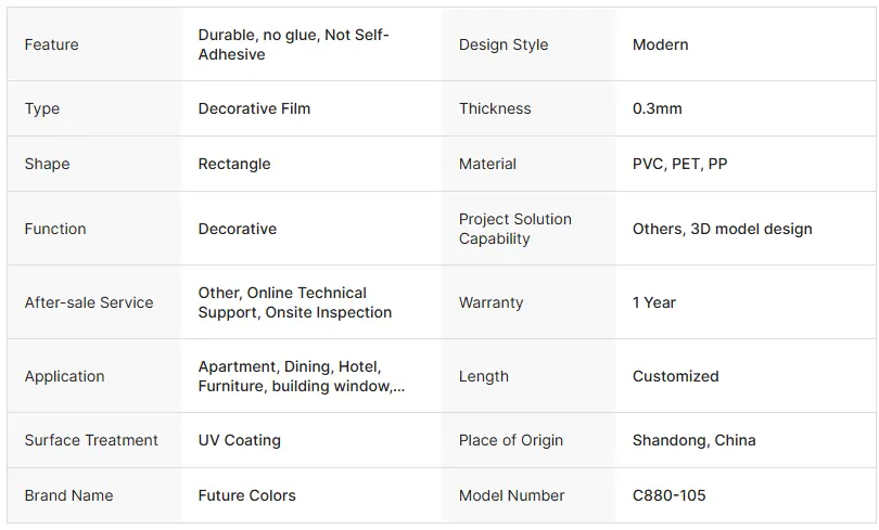 അടിസ്ഥാന മെറ്റീരിയലായി ഉയർന്ന തന്മാത്രാ പ്ലാസ്റ്റിക് ഉപയോഗിക്കുന്ന അലങ്കാര ചലച്ചിത്രവസ്തുക്കളാണ് മോഡേൺ സോളിഡ് കളർ ബ്ലിസ്റ്റർ ഫിലിം. കളറിംഗിനും കോട്ടിംഗ് ചികിത്സയ്ക്കും ശേഷം, ഇത് "ബ്ലിസ്റ്റർ പ്രോസസ്സ്" വഴി ഒരു വേദികൾ നേടി (വാക്വം ആഡംബരപ്ഷൻ മോൾഡിംഗ്). ഇതിന് "യൂണിഫോം നിറം, ശക്തമായ പ്ലാസ്റ്റിറ്റി, ഉയർന്ന ചെലവ്-ഫലപ്രാപ്തി എന്നിവ സവിശേഷതകൾ", ഫർണിച്ചർ, അലങ്കാരം, പാക്കേജിംഗ് തുടങ്ങിയ മേഖലകളിൽ വ്യാപകമായി ഉപയോഗിക്കുന്നു. ആധുനിക മിനിമലിസ്റ്റ് ശൈലി രൂപകൽപ്പനയിൽ സാധാരണയായി ഉപയോഗിക്കുന്ന മെറ്റീരിയലുകളിൽ ഒന്നാണിത്.